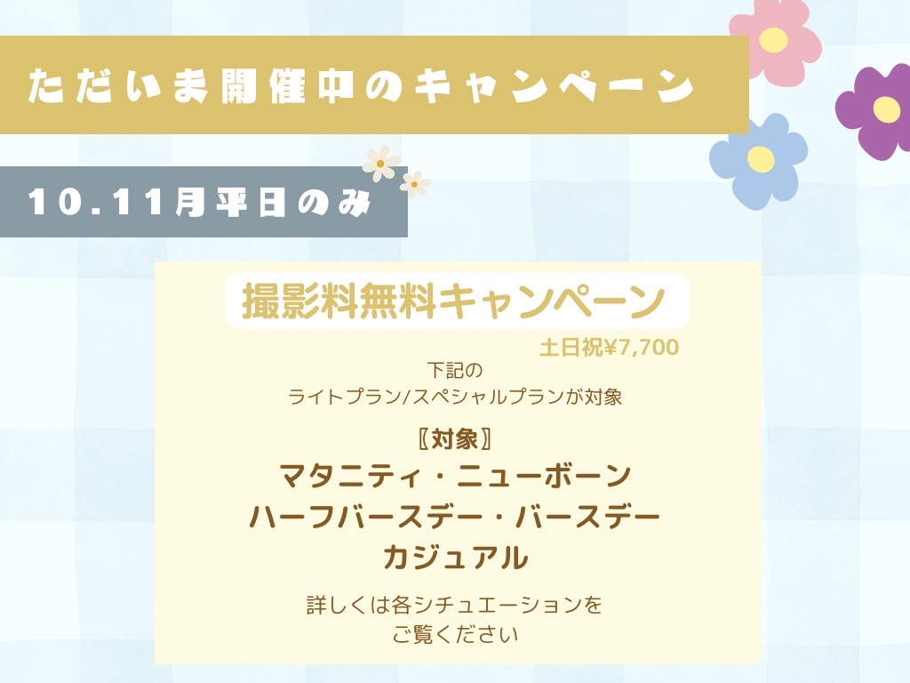※授乳など挟まれる場合は、撮影パターンが少なくなる場合がございます。
